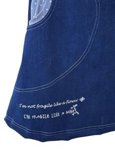 Skjørtet er sydd i dongeri (98 % bomull, 2 % elastan) med veldig god stretch, har lommer og håndtrykket tekst  på skjørtekanten. Det er bred elastikk i midjen.