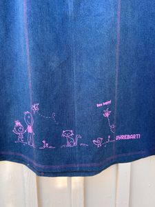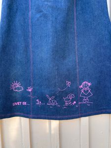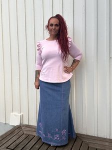 Skjørtet er sydd i dongeri (98 % bomull, 2 % elastan) med god stretch. Siden dette er et skjørt som skal være litt tettsittende øverst på kroppen, og siden stretch jeansstoff har en tendens til å vide seg litt ut etter bruk, syr jeg skjørtet litt smalere, sammenlignet med tilsvarende skjørt sydd i viskose jersey, slik at passformen holder seg så fin som mulig også etter litt bruk :) (Derfor blir ikke målene helt lik som i måleskjemaet)