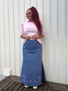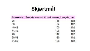 Lengden er ca 102 cm i alle størrelser. Jeg er 168 cm høy og på bildene har jeg på meg skjørt i str 48. Hvis du er mye lavere/høyere og trenger kortere/lengre skjørt, ta kontakt med meg, så ordner jeg det.