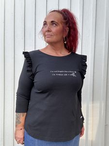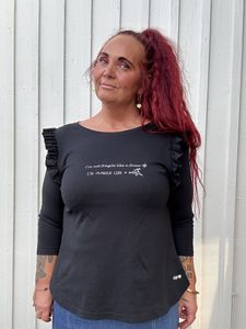 Genseren er tightere over bysten og har litt innsving i midjen og buet kant nederst. Den har 3/4 lange ermer og volanger. Det er håndtrykket tekst på genseren.