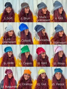 Myk og baggy lue i 96% bomull og 4% elastan, med håndtrykket tekst på.