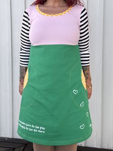 Kjolen 3/4 lange ermet, lommer og håndtrykket tekst og på skjørtekanten. Bryststykket og ermene er sydd i jerseystoff, mens skjørtet er i jeansstoff med god stretch.