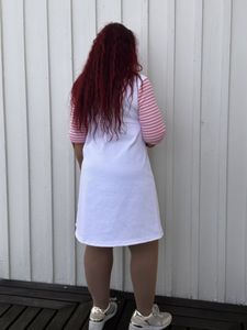 Toppen på kjolen er i jersey, mens skjørtet er i stretch jeans. Kjolen har 3/4 lange ermer, lommer og håndtrykket tekst på skjørtekanten.